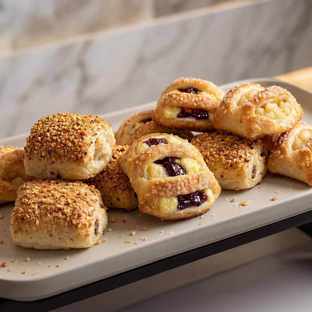 Bereits fertig gebackener Mini-Fruchtplunder-Mix bestehend aus: