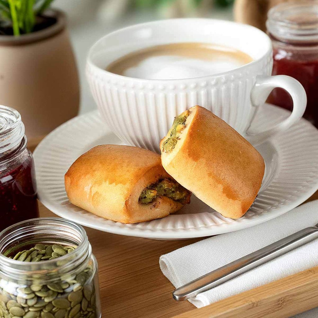Das vegane Mini-Gebäck überzeugt mit einer hausgemachten Füllung aus gemahlenen Kürbiskernen und einer dezenten Süße.