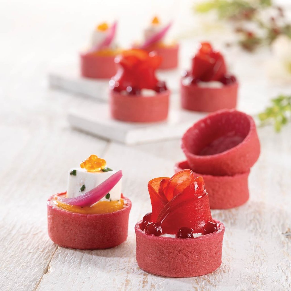 Dank des neutralen Teigs können diese roten Mini-Tartelettes sowohl süß als auch salzig befüllt werden. Eine zusätzliche, geschmacksneutrale Schicht aus Pflanzenöl sorgt dafür, dass die Tartelettes auch nach dem Füllen lange formstabil und knusprig bleiben.