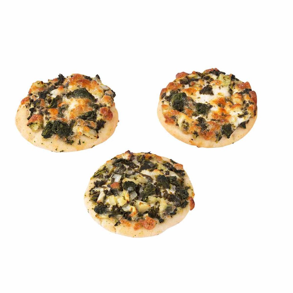 Knusperdünne Pizzahäppchen für genussvolle Momente. Knuspriger Pizzateigboden randfrei bestrichen mit einer würzigen Sauerrahmsosse, belegt mit mildem Mozzarellakäse, Spinat.