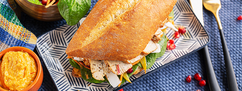 Wie wäre es mit einem exotischen Sandwich? Belegen Sie unser klassisches Farmerbrötchen mit Hähnchenbrust, Granatapfel und Mango - fertig ist das etwas andere Sandwich.