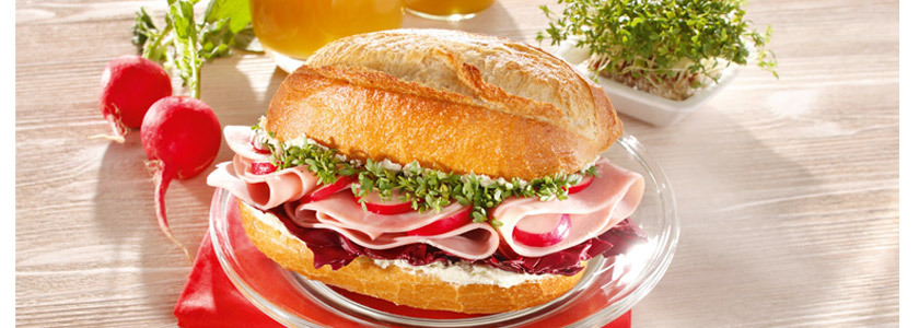 3. Radicchio in kleine Stücke rupfen und auf den Unterseiten der Brötchen drapieren. Kochschinken, Radieschen und Kresse auf die Sandwiches geben, dann die Deckel aufsetzen.