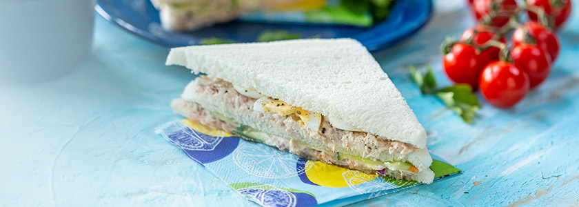 3. Die zwei Tramezzinoscheiben jeweils in vier Teile zerschneiden und dann jeweils diagonal halbieren. Die Thunfischcreme auf alle Toasts streichen und fünf der bestrichenen Toasts mit Gurke und Ei belegen. Dann die Toasts zusammensetzen und mit Salatblättern servieren.